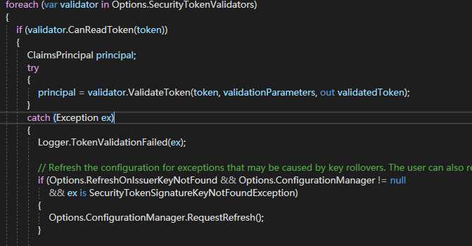 调用JwtBearerOptions配置参数中的SecurityTokenValidators,源码如下: