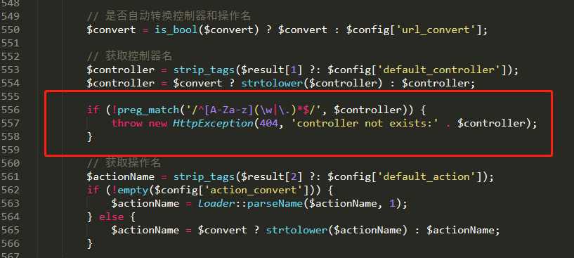if (!preg_match(‘/^[A-Za-z](\w|\.)*$/‘, $controller)) { throw new HttpException(404, ‘controller not exists:‘ . $controller); }