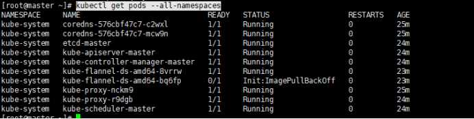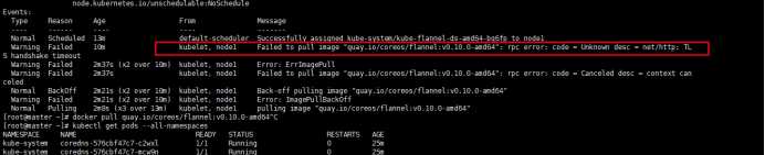 b、kubectl describe pod kube-flannel-ds-amd64-bq6fp --namespace=kube-system 看出node1上flannel镜像下载失败,去node1上手动下载镜像