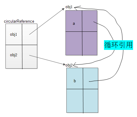 从上图可以看出 obj1 中的 a 属性引用 obj2,obj2 中的 b 属性引用 obj1,这样就构成了循环引用。