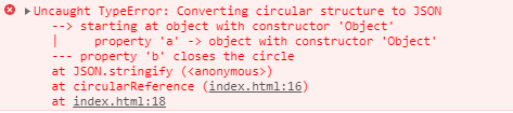 我们可以从加粗的字体中看到,对包含循环引用的对象执行 JSON.stringify,会抛出错误。