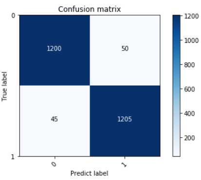 [[1200 50] [ 45 1205]]0.960.9640.962