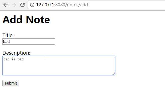 {{define "head"}}<title>Add Note</title>{{end}}{{define "body"}}<h1>Add Note</h1><form action="/notes/save" method="post"> <p>Title:<br> <input type="text" name="title"></p> <p>Description:<br> <textarea rows="4" cols="50" name="description"></textarea> </p> <p><input type="submit" value="submit"/> </p></form>{{end}}