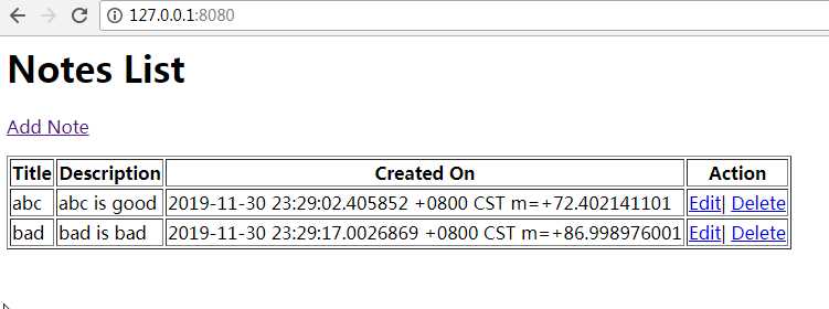 {{define "head"}}<title>Index</title>{{end}}{{define "body"}}<h1>Notes List</h1><p><a href="/notes/add">Add Note</a></p><div> <table border="1"> <tr> <th>Title</th> <th>Description</th> <th>Created On</th> <th>Action</th> </tr> {{range $key,$value := .}} <tr> <td>{{$value.Title}}</td> <td>{{$value.Description}}</td> <td>{{$value.CreatedOn}}</td> <td> <a href="/notes/edit/{{$key}}">Edit</a>| <a href="/notes/delete/{{$key}}">Delete</a> </td> </tr> {{end}} </table></div>{{end}}