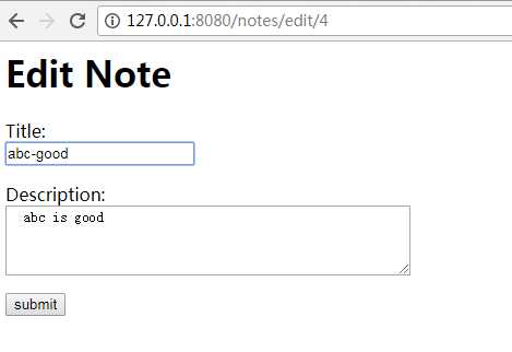 {{define "head"}}<title>Edit Note</title>{{end}}{{define "body"}}<h1>Edit Note</h1><form action="/notes/update/{{.Id}}" method="post"> <p>Title:<br> <input type="text" value="{{.Note.Title}}" name="title"></p> <p> Description:<br> <textarea rows="4" cols="50" name="description"> {{.Note.Description}}</textarea> </p> <p><input type="submit" value="submit"/></p></form>{{end}}