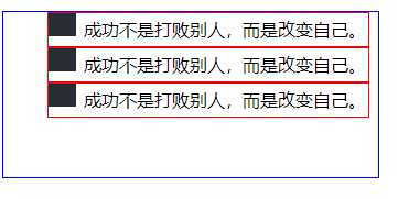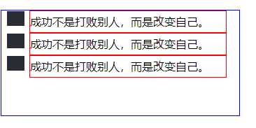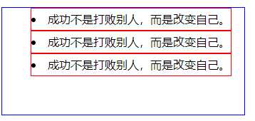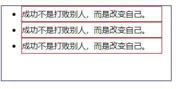 Copy <!DOCTYPE html><html lang="en"><head> <meta charset="UTF-8"> <meta name="viewport" content="width=device-width, initial-scale=1.0"> <meta http-equiv="X-UA-Compatible" content="ie=edge"> <title>属性值为outside使用方式</title> <style> ul { width: 300px; height: 150px; border: 1px solid #00F; } ul li { width: 280px; height: 30px; line-height: 30px; border: 1px solid red; } </style></head> <body> <ul> <li>成功不是打败别人,而是改变自己。</li> <li>成功不是打败别人,而是改变自己。</li> <li>成功不是打败别人,而是改变自己。</li> </ul> </body></html>结果图