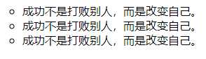 Copy <!DOCTYPE html><html lang="en"><head> <meta charset="UTF-8"> <meta name="viewport" content="width=device-width, initial-scale=1.0"> <meta http-equiv="X-UA-Compatible" content="ie=edge"> <title>列表的list-style-type属性值为circle实践</title> <style> .box{ list-style-type: circle; } </style></head> <body> <ul class="box"> <li>成功不是打败别人,而是改变自己。</li> <li>成功不是打败别人,而是改变自己。</li> <li>成功不是打败别人,而是改变自己。</li> </ul></body></html>结果图
