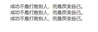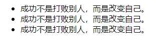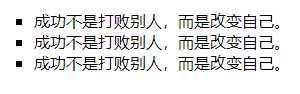 Copy <!DOCTYPE html><html lang="en"><head> <meta charset="UTF-8"> <meta name="viewport" content="width=device-width, initial-scale=1.0"> <meta http-equiv="X-UA-Compatible" content="ie=edge"> <title>列表的list-style-type属性值为none实践</title></head> <body> <ul> <li>成功不是打败别人,而是改变自己。</li> <li>成功不是打败别人,而是改变自己。</li> <li>成功不是打败别人,而是改变自己。</li> </ul></body></html>结果图