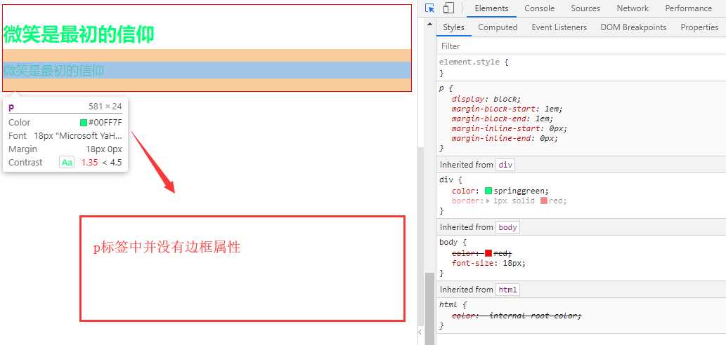 Copy <!DOCTYPE html><html lang="en"><head> <meta charset="UTF-8"> <meta name="viewport" content="width=device-width, initial-scale=1.0"> <meta http-equiv="X-UA-Compatible" content="ie=edge"> <title>继承性</title> <style> body{ color: red; font-size: 18px; } div{ color: springgreen; border: 1px solid red; } </style></head> <body> <div> <h2>微笑是最初的信仰</h2> <p>微笑是最初的信仰</p> </div></body></html>结果图