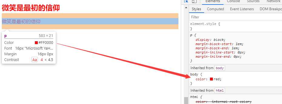 Copy <!DOCTYPE html><html lang="en"><head> <meta charset="UTF-8"> <meta name="viewport" content="width=device-width, initial-scale=1.0"> <meta http-equiv="X-UA-Compatible" content="ie=edge"> <title>继承性</title> <style> body{ color: red; } </style></head> <body> <div> <h2>微笑是最初的信仰</h2> <p>微笑是最初的信仰</p> </div></body></html>结果图