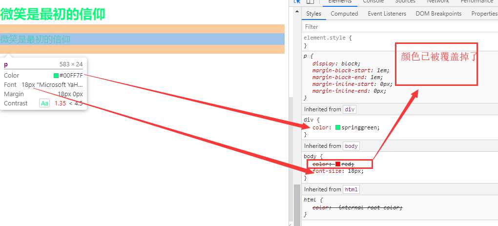 Copy <!DOCTYPE html><html lang="en"><head> <meta charset="UTF-8"> <meta name="viewport" content="width=device-width, initial-scale=1.0"> <meta http-equiv="X-UA-Compatible" content="ie=edge"> <title>继承性</title> <style> body{ color: red; font-size: 18px; } div{ color: springgreen; } </style></head> <body> <div> <h2>微笑是最初的信仰</h2> <p>微笑是最初的信仰</p> </div></body></html>结果图