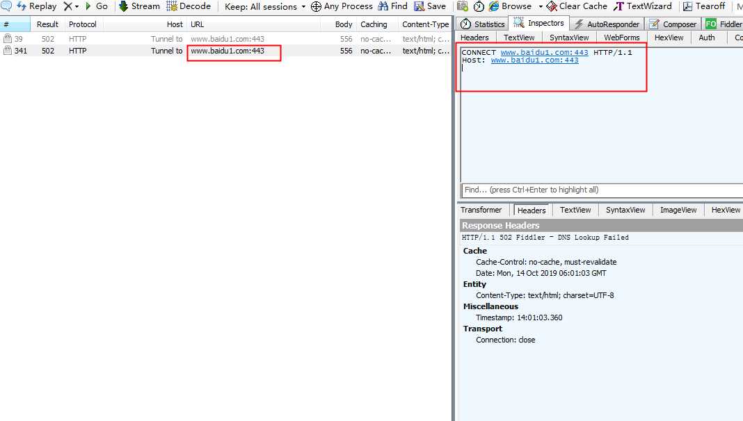 最后查看Fiddler的监控请求,可以看到我们已经抓到了请求域名为:www.baidu1.com的程序内的请求了(模拟程序内代理请求成功):