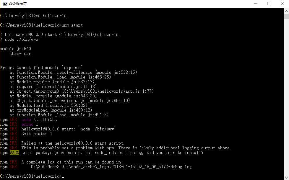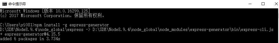 注:如果安装时不加 -g 参数,则安装的模块就会安装在当前路径下,上例若不加 -g 参数,则 express 模块会安装在 C:\Users\yi081目录下的 【node_modules】目录下,目录若不存在会自动生成。