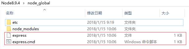 打开全局安装目录发现没有 express 的可执行文件,如下图: