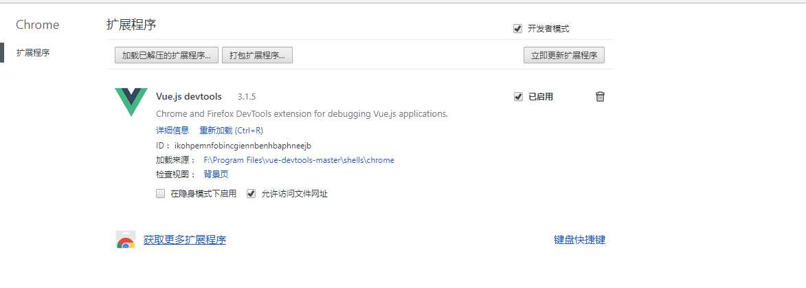 然后将刚刚编译后的工程中的shells目录下,chrome的整个文件夹直接拖拽到当前浏览器中,并选择启用,即可将插件安装到浏览器。