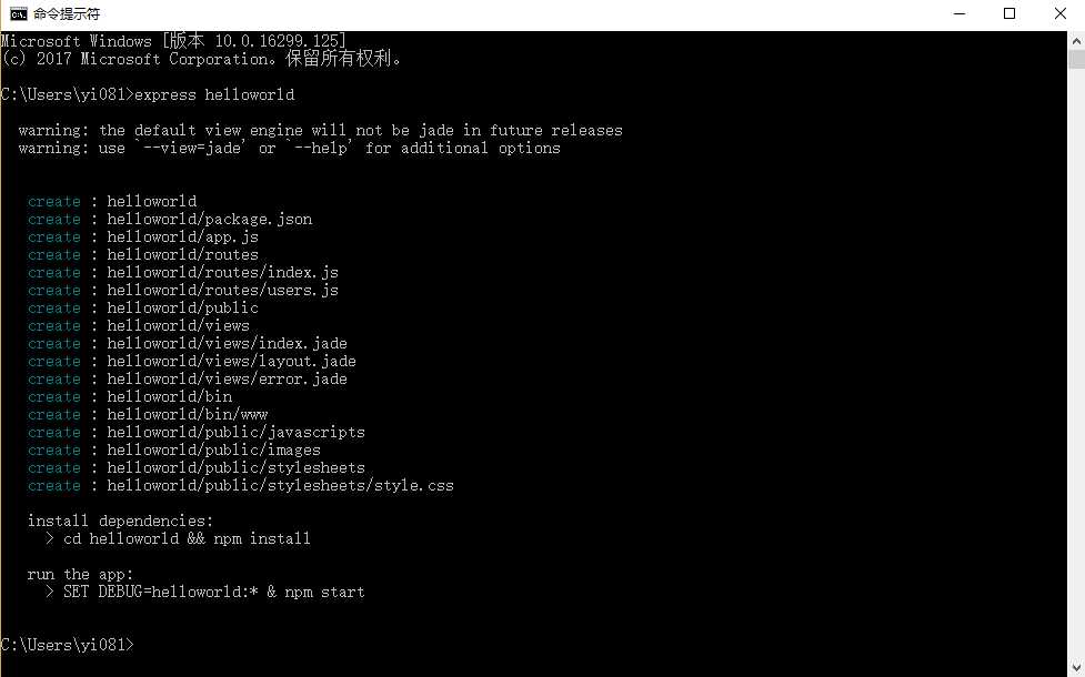 使用express创建一个工程,输入命令:express helloworld