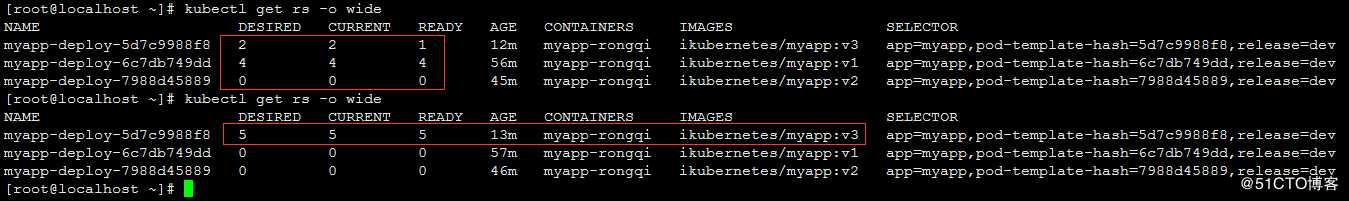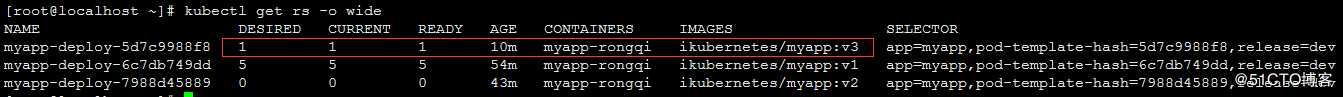 [root@cs25 ~]# kubectl get pod -l app=myapp -wNAME READY STATUS RESTARTS AGEmyapp-deploy-576d479bcc-bt7hz 1/1 Running 0 47mmyapp-deploy-576d479bcc-bzqwv 1/1 Running 0 11mmyapp-deploy-576d479bcc-hf6kb 1/1 Running 0 47mmyapp-deploy-576d479bcc-hgb6w 1/1 Running 0 11mmyapp-deploy-576d479bcc-vztqp 1/1 Running 0 11mmyapp-deploy-7f969b64fb-2frdn 0/1 Pending 0 0smyapp-deploy-576d479bcc-vztqp 1/1 Terminating 0 12mmyapp-deploy-7f969b64fb-6lhjw 0/1 Pending 0 0smyapp-deploy-7f969b64fb-2frdn 0/1 Pending 0 0smyapp-deploy-7f969b64fb-6lhjw 0/1 Pending 0 0smyapp-deploy-7f969b64fb-5ms8f 0/1 Pending 0 0smyapp-deploy-7f969b64fb-5ms8f 0/1 Pending 0 0smyapp-deploy-7f969b64fb-6lhjw 0/1 ContainerCreating 0 1smyapp-deploy-7f969b64fb-2frdn 0/1 ContainerCreating 0 1smyapp-deploy-7f969b64fb-5ms8f 0/1 ContainerCreating 0 0smyapp-deploy-7f969b64fb-2frdn 0/1 ContainerCreating 0 35smyapp-deploy-7f969b64fb-5ms8f 0/1 ContainerCreating 0 35smyapp-deploy-7f969b64fb-6lhjw 0/1 ContainerCreating 0 36smyapp-deploy-576d479bcc-vztqp 0/1 Terminating 0 12mmyapp-deploy-576d479bcc-vztqp 0/1 Terminating 0 12mmyapp-deploy-576d479bcc-vztqp 0/1 Terminating 0 12mmyapp-deploy-7f969b64fb-5ms8f 1/1 Running 0 43smyapp-deploy-7f969b64fb-2frdn 1/1 Running 0 47smyapp-deploy-7f969b64fb-6lhjw 1/1 Running 0 51smyapp-deploy-576d479bcc-hgb6w 1/1 Terminating 0 13mmyapp-deploy-576d479bcc-bzqwv 1/1 Terminating 0 13mmyapp-deploy-576d479bcc-bt7hz 1/1 Terminating 0 49mmyapp-deploy-7f969b64fb-gprvk 0/1 Pending 0 0smyapp-deploy-7f969b64fb-fwdbr 0/1 Pending 0 0smyapp-deploy-7f969b64fb-fwdbr 0/1 Pending 0 1smyapp-deploy-7f969b64fb-gprvk 0/1 Pending 0 1smyapp-deploy-7f969b64fb-fwdbr 0/1 ContainerCreating 0 1smyapp-deploy-7f969b64fb-gprvk 0/1 ContainerCreating 0 1smyapp-deploy-576d479bcc-hgb6w 0/1 Terminating 0 13mmyapp-deploy-576d479bcc-bzqwv 0/1 Terminating 0 13mmyapp-deploy-7f969b64fb-fwdbr 0/1 ContainerCreating 0 18smyapp-deploy-7f969b64fb-gprvk 0/1 ContainerCreating 0 19smyapp-deploy-576d479bcc-hgb6w 0/1 Terminating 0 13mmyapp-deploy-576d479bcc-bt7hz 0/1 Terminating 0 49mmyapp-deploy-576d479bcc-bzqwv 0/1 Terminating 0 13mmyapp-deploy-7f969b64fb-gprvk 1/1 Running 0 20smyapp-deploy-7f969b64fb-fwdbr 1/1 Running 0 20skubectl get rs -o wide #使用命令查看