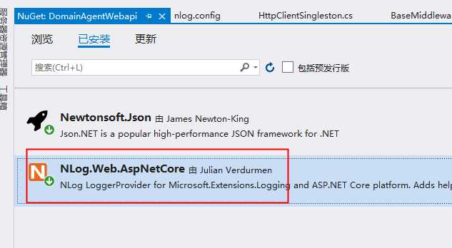 最后是给项目注入NLog的Nuget核心包引用: