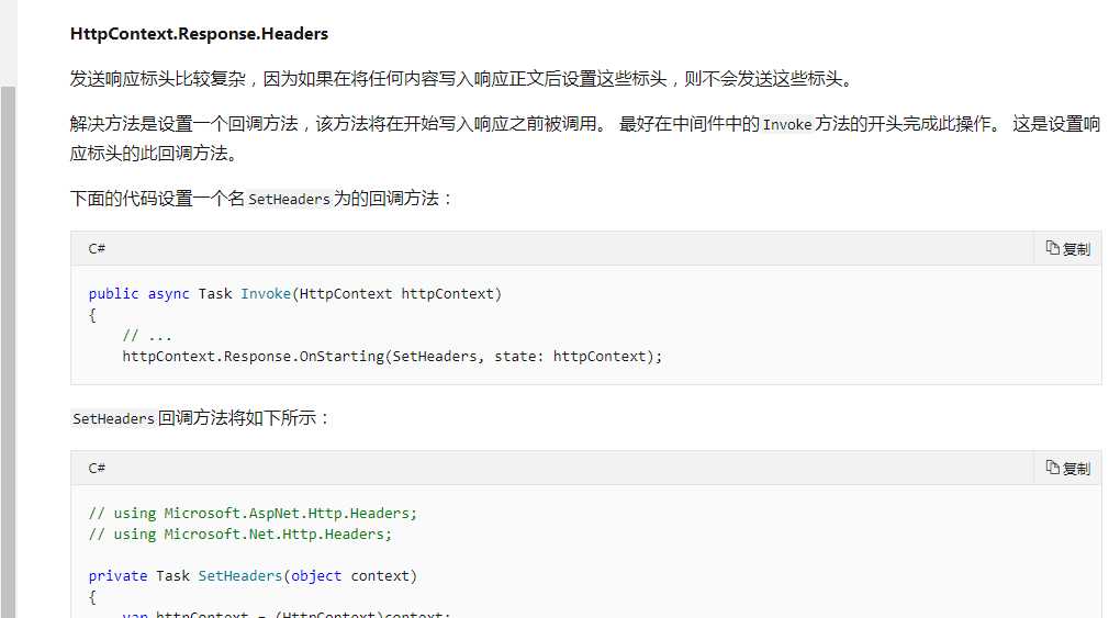 bug7:官网文档给了解决方案,总之就是,你不要在response写入消息后再修改response就好了。 参照官方文档: 发送HttpContext.Response.Headers