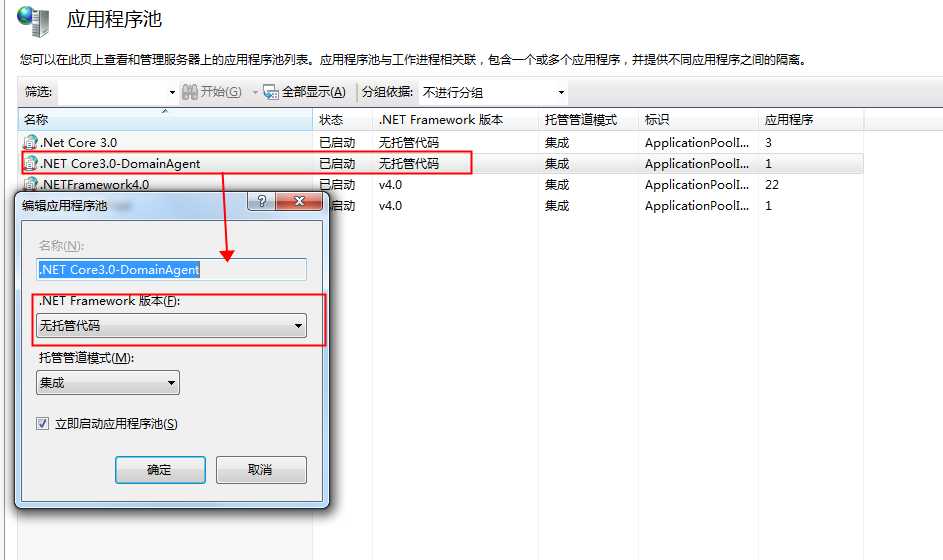 bug0:一般会在第一次在IIS上调试core项目会遇到,一般是因为电脑未安装AspNetCoreModuleV2对IIS支持Core的模块导致,还需要检查项目的应用程序池的.Net Framework版本是否是选择的无托管模式。