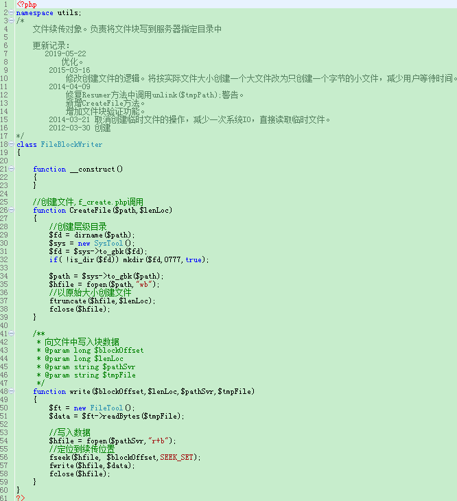 分则必合。把大文件分片了,但是分片了就没有原本文件功能,所以我们要把分片合成为原本的文件。我们只需要把分片按原本位置写入到文件中去。因为前面原理那一部我们已经讲到了,我们知道分块大小和分块序号,我就可以知道该分块在文件中的起始位置。所以这里使用RandomAccessFile是明智的,RandomAccessFile能在文件里面前后移动。但是在andomAccessFile的绝大多数功能,已经被JDK1.4的NIO的“内存映射文件(memory-mapped files)”取代了。我在该项目中分别写了使用RandomAccessFile与MappedByteBuffer来合成文件。分别对应的方法是uploadFileRandomAccessFile和uploadFileByMappedByteBuffer。两个方法代码如下。