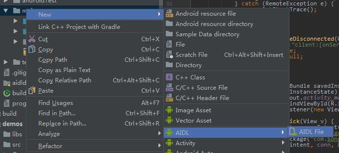 (1)在Server端IDemoService.aidl同一目录中添加一个新的.aidl接口文件,我这里命名为IDemoCallback.aidl,内容如下: