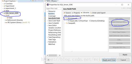 然后进入eclipse界面,找到的当前工程文件,点击右键,选中properties->Libraries->addexternal jars->找到我们刚刚下载到的sqljdbc42.jar类库,添加即可。