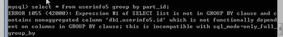 发现筛选时报错了,老师的解释实说,分组是因为mysql不知道选择谁而出现报错,因为part_id 有两个。通过查阅我发现了可以通过改配置不会报错,默认是好像是选择小的那个,详见自己的博客:https://www.cnblogs.com/accolade/p/10620318.html