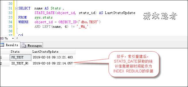 如上所示,STATS_DATE获取索引的统计信息更新时间,似乎可以作为索引创建的时间。但是我后面就有例子,反证这个是不准确(不靠谱)的。接下来,我们看看,使用STATS_DATE来获取索引重建的时间。如下所示: