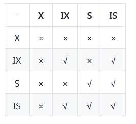任意 IS/IX 锁之间都是兼容的,因为它们只是表示想要对表加锁,而不是真正加锁;