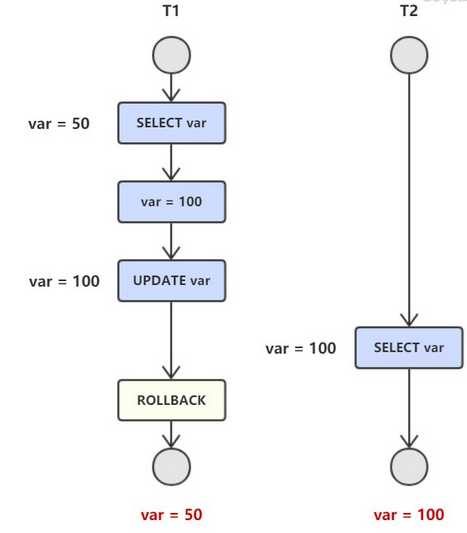 脏读:事务T1修改了数据,事务T2读取了修改后的数据。随后T1回滚撤销了修改,事务T2读取到的就是脏数据。
