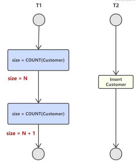 幻读:T1读取某个范围的数据,T2在这个范围了插入了一条数据,T1再次读取这个范围了数据,和第一次读取的结果不同。