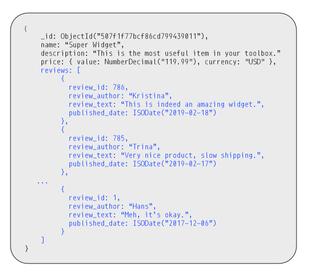 Imagine an e-commerce site that has a list of reviews for a product. When accessing that product‘s data it‘s quite possible that we‘d only need the most recent ten or so reviews. Pulling in the entirety of the product data with all of the reviews could easily cause the working set to expand.