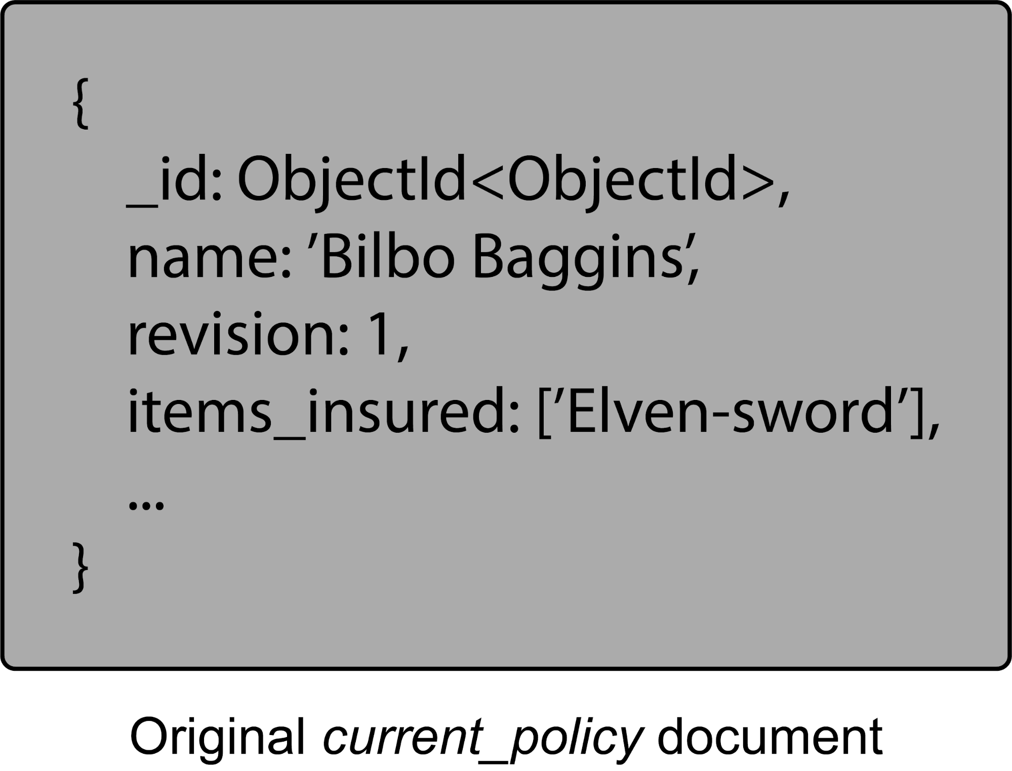 for its customers. All residents of The Shire would share this particular policy document. Bilbo has specific things he wants insuring on top of his normal coverage. His Elven Sword and, eventually, the One Ring are added to his policy. These would reside in the current_policies