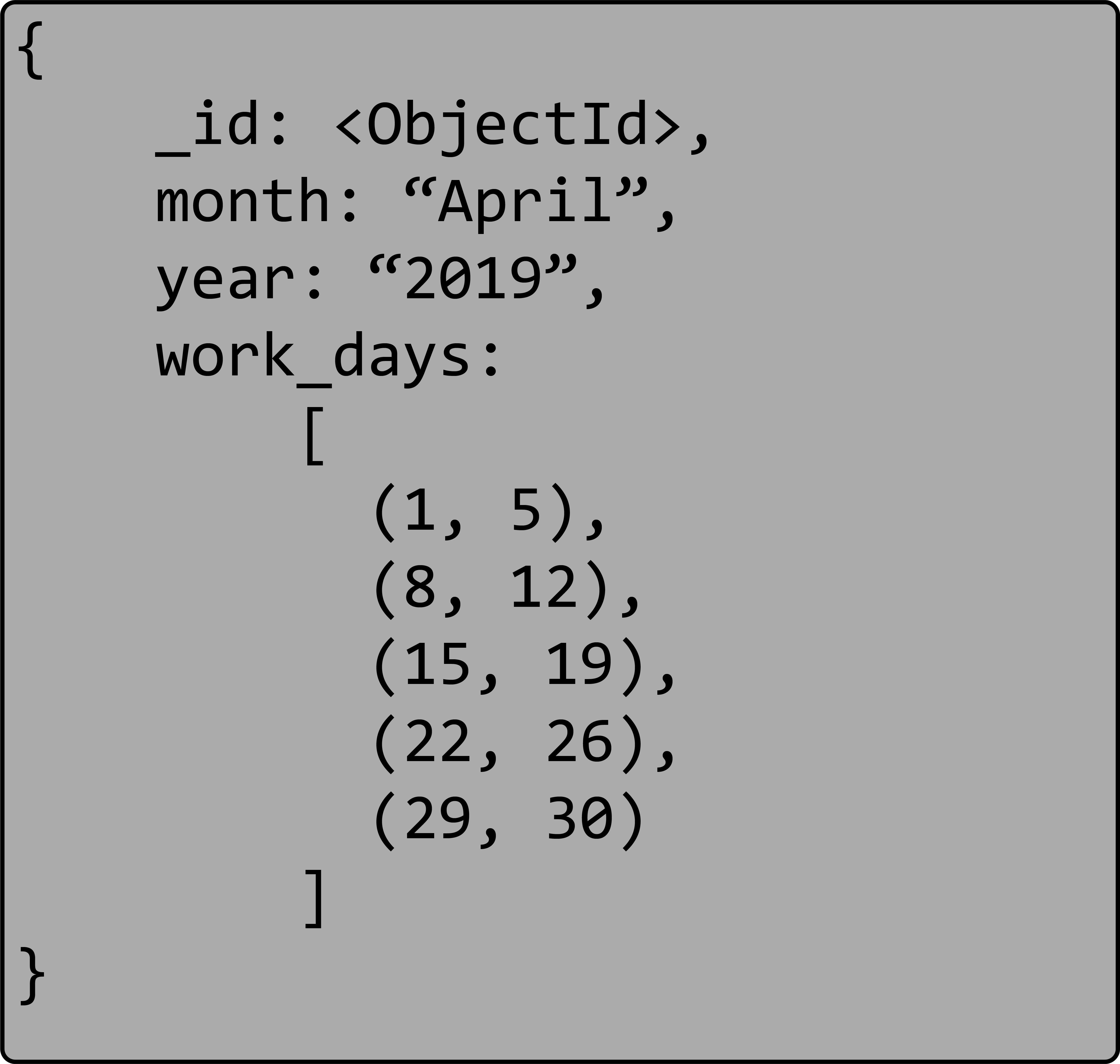 { sensor_id: 12345, start_date: ISODate("2019-01-31T10:00:00.000Z"), end_date: ISODate("2019-01-31T10:59:59.000Z"), measurements: [ { timestamp: ISODate("2019-01-31T10:00:00.000Z"), temperature: 40 }, { timestamp: ISODate("2019-01-31T10:01:00.000Z"), temperature: 40 }, … { timestamp: ISODate("2019-01-31T10:42:00.000Z"), temperature: 42 } ], transaction_count: 42, sum_temperature: 2413 }