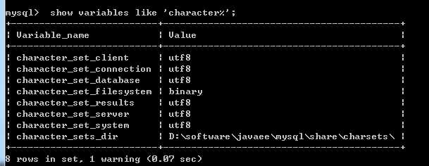 mysql> set character_set_client=utf8 ;mysql> set character_set_connection=utf8 ;mysql> set character_set_database=utf8 ;mysql> set character_set_database=utf8 ;mysql> set character_set_results=utf8 ;mysql> set character_set_server=utf8 ;mysql> set character_set_system=utf8 ;