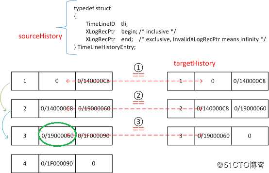 ? 4)取第3个条目进行返回:MinXLogRecPtr(sourceHistory[i].end, targetHistory[i].end),此时返回的是sourceHistory[i].end的值作为分叉点,即 0/1F000090